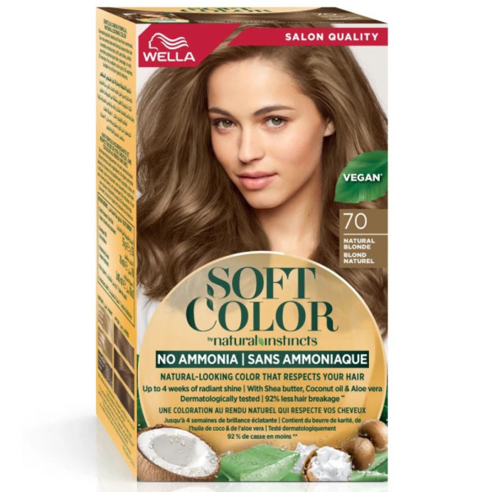 Фарба для волосся Wella Soft Color порадує вас бездоганним натхненням на природність і красу, пропонуючи чудовий відтінок 70 - Натуральний блонд. Ця безаміачна фарба створена для тих, хто обирає гармонію з природою, адже вона має веганську формулу та забезпечує 100% природний сяючий колір.