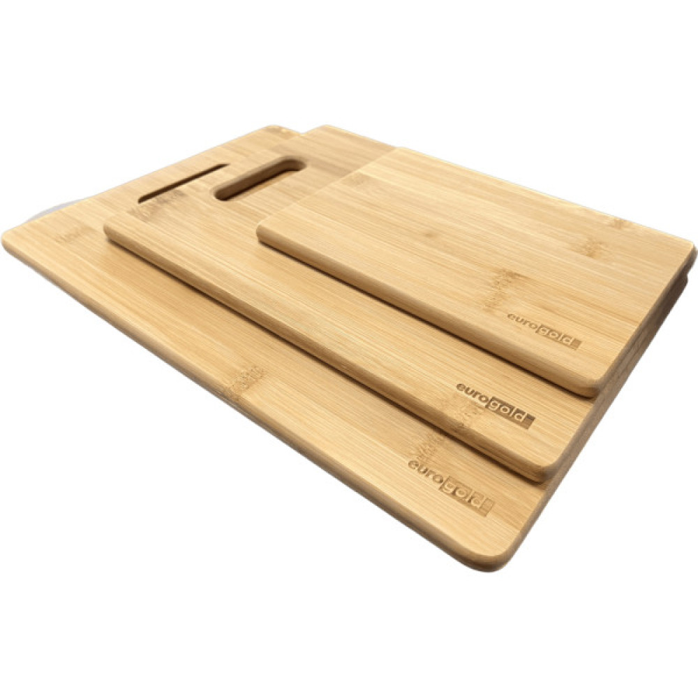 В наборі бамбукових дощок для нарізання Eurogold є три дошки різної форми, що дозволить використовувати їх як для нарізання овочів, так і для подачі закусок. При використанні бамбукових дощок для нарізання ваші ножі довше залишатимуться гострими і довше триматимуть заточку. Доповніть свою кухню якісним набором, що б зробити приготування їжі більш зручнішим та ефективним. Не рекомендуємо мити в посудомийній машині або залишати надовго у воді, що б уникнути деформації.