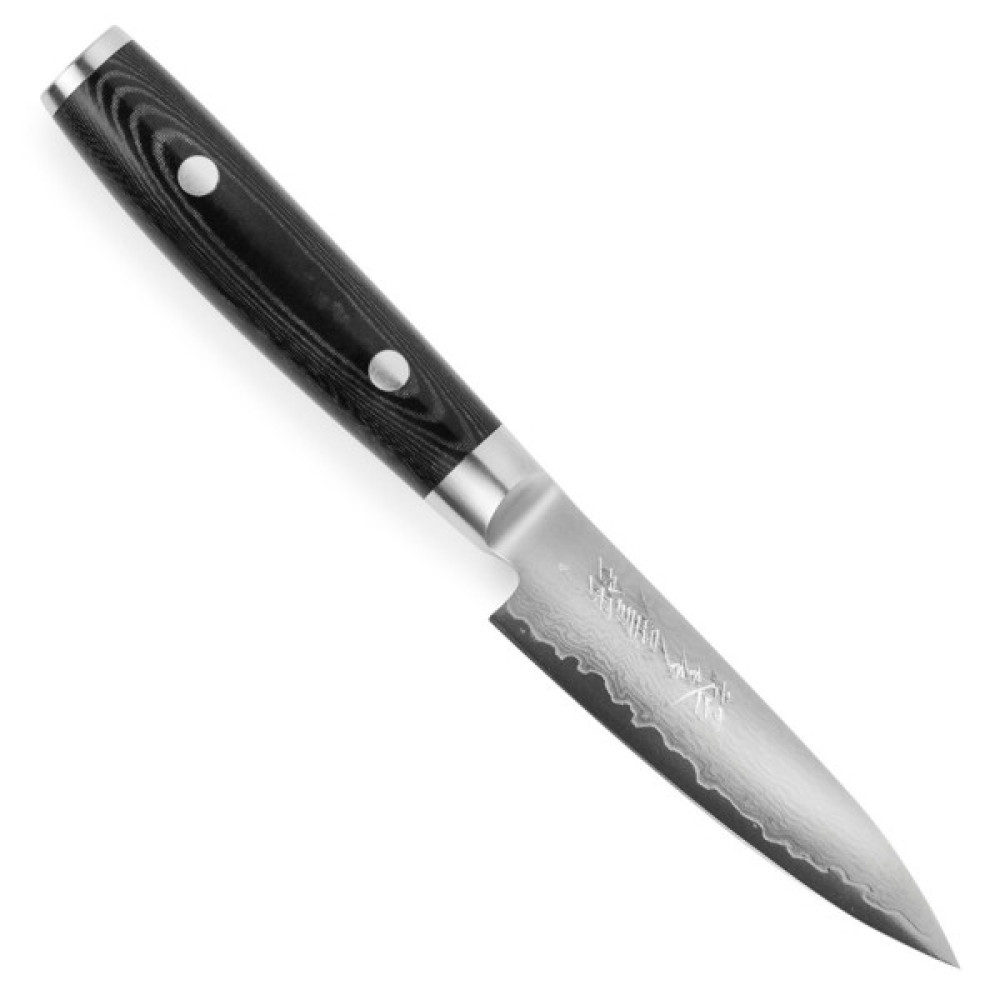 Японський ніж для чистки овочів серії RAN PLUS з лезом із дамаської сталі підходить для щоденного використання на професійній або домашній кухні, оскільки витримує будь-яке робоче навантаження. В основі високоякісна сталь VG10 (кобальт, молібден, ванадій), покрита захисними обкладками із 68 шарів нержавіючої сталі з ефектним дамаським візерунком на лезі. На відміну від серії RAN на лезі RAN PLUS з’явився вигравіруваний вручну напис у вигляді ієрогліфів – “RAN Багатошаровий Ніж”.
