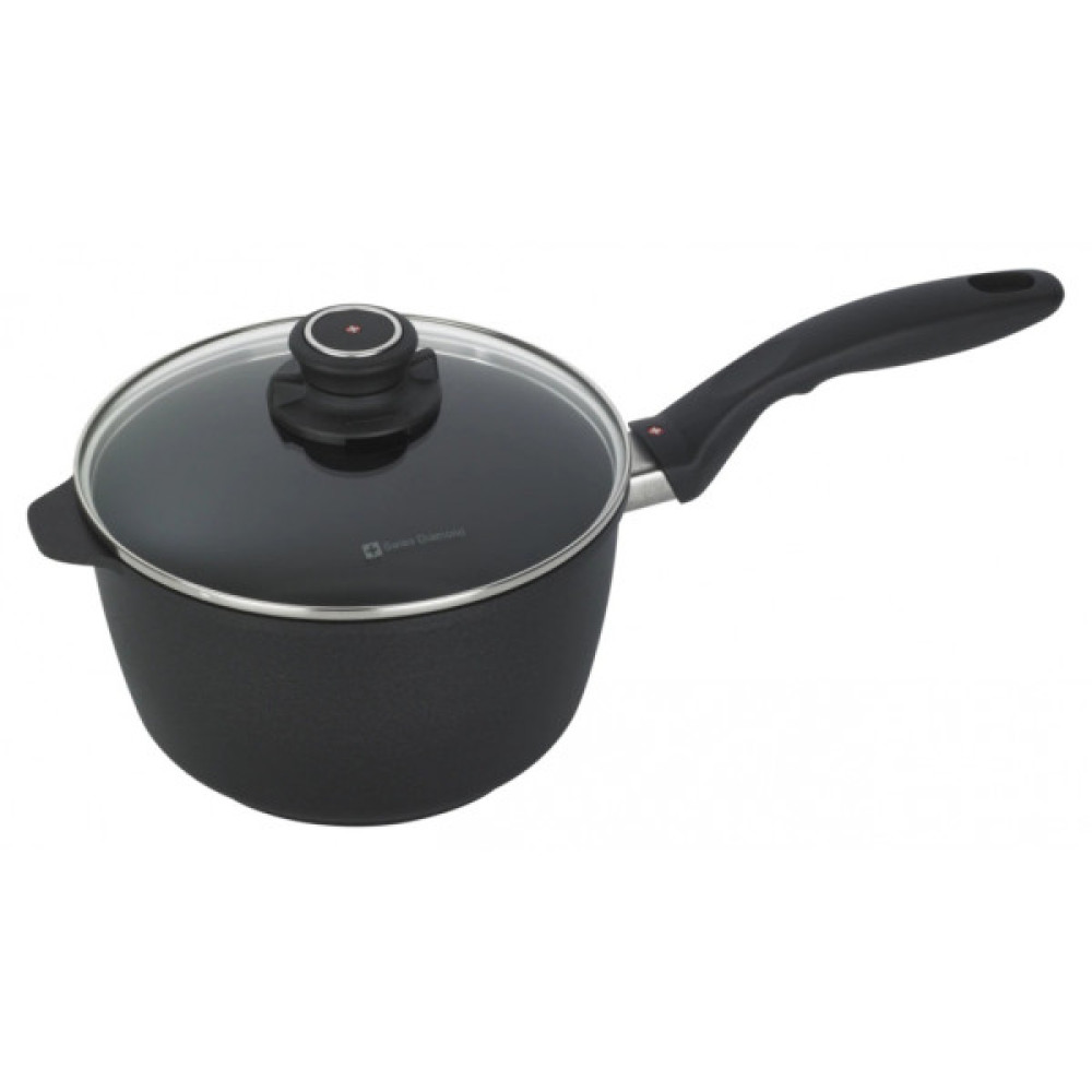 Це посуд преміум класу, виготовлений із високоякісного литого алюмінію. Ергономічні ручки з термостійкого бакеліту, розроблені з урахуванням необхідної противаги, дозволяють використовувати ківш у духовці за температури до 260 °С. Кришка із загартованого скла оснащена характерним для посуду Swiss Diamond регульованим отвором для пари.