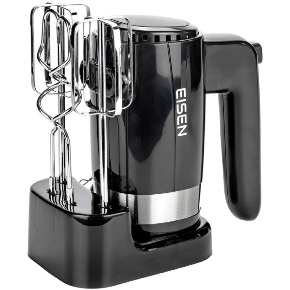Ручний міксер EISEN EHM-50 є універсальною моделлю “2 в 1” і надійним помічником на кухні. Він має потужність 500 Вт і швидко впорається з різними кулінарними завданнями. У нього є два вінчика для збивання та два гаки для тіста, а також п’ять ступенів регулювання швидкості та турбо-режим. Головною особливістю цієї моделі є підставка для зберігання міксера та насадок. Щоб забезпечити безпечну роботу пристрою, він має функцію захисту від перегріву.