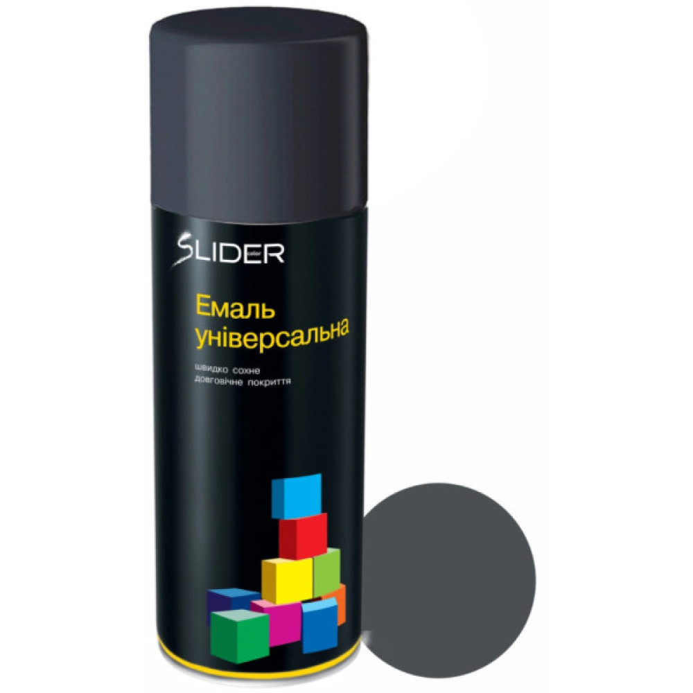 Емаль SLIDER універсальна - універсальна швидковисихаюча аерозольна емаль SLIDER - підходить для фарбування пластикових, дерев'яних та металевих основ. Має стійкість до вицвітання і втрати кольору. Велика палітра кольорів сприяє більш легкому вибору.