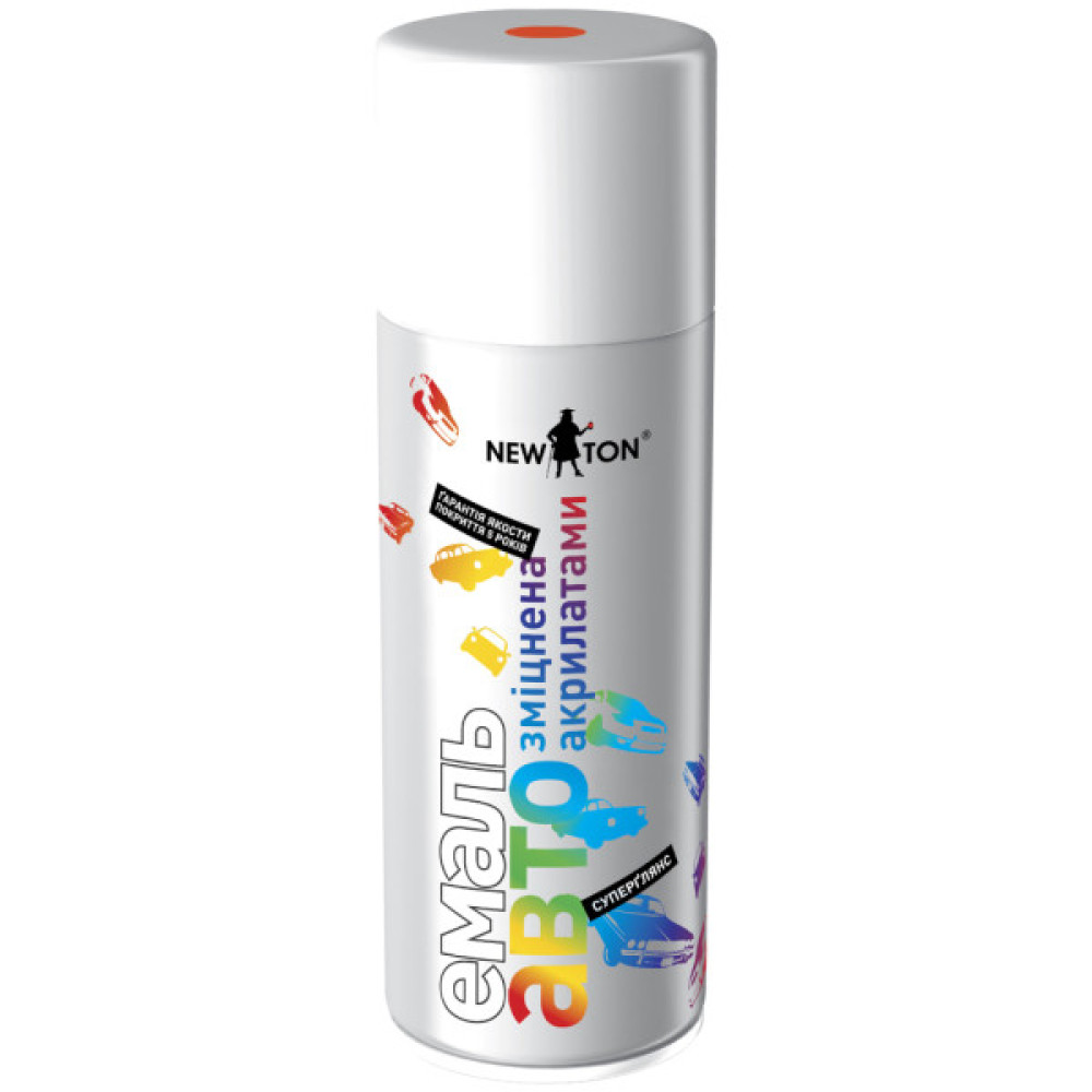 Емаль NEW TON авто - високоміцна емаль алкідна, посилена акрилатами. Утворює довговічне глянсове покриття стійке до механічних та атмосферних впливів. Має високий рівень адгезії. Чи не вигоряє на сонці і не втрачає блиску. Розроблена спеціально для виконання дрібного ремонту, фарбування, реставрації лакофарбового покриття автомобілів, мотоциклів, моторолерів, велосипедів, снігоходів, сільськогосподарської техніки, дрібних плавзасобів (вище за ватерлінію), у тому числі човнів, скутерів, катерів тощо. Використовується також для фарбування металевих , скляні, дерев'яні, бетонні, деякі пластмасові поверхні. Для зовнішніх та внутрішніх робіт. Площа покриття залежно від кольору та товщини шару становить 0,8-1,0 м2 - 150 мл, 1,5-2,0 м2 - 400мл. Час висихання 20–25 хв за температури +25ºС. На кришці балона є реальний зразок кольору емалі. Об'єм 400мл.