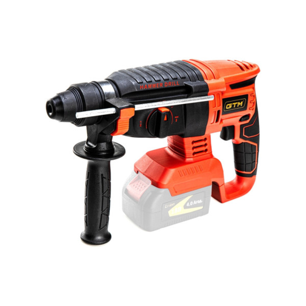 GTM RHC18/26BL - безщітковий перфоратор професійного класу з живленням від Li-Ion акумуляторів напругою 18 В. У перфоратор і встановлений патрон SDS+ для бурів. У даній моделі присутні 4 режими роботи: свердління / свердління з ударом / довбання / поворот піки.