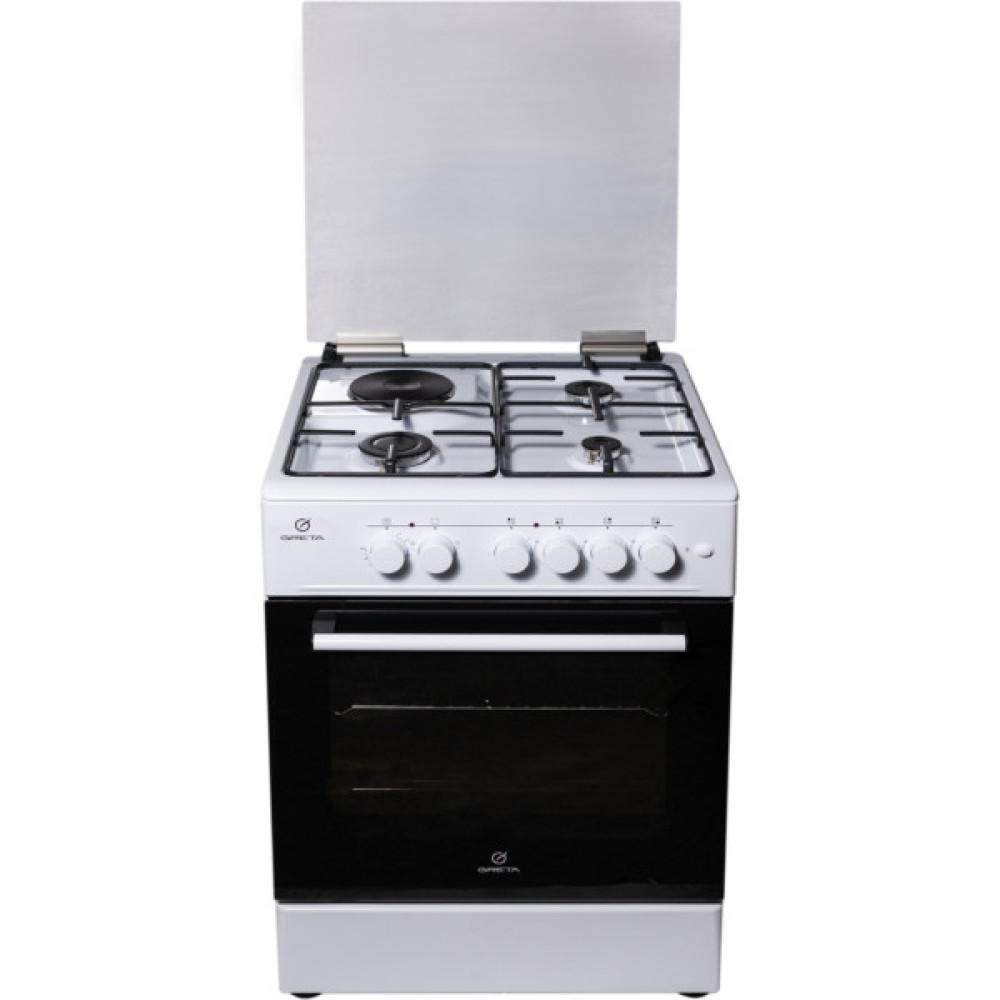 Комбінована плита, комбінована варильна поверхня, 3 газові конфорки, електрозапалювання кнопкою та газ контроль конфорок, 1 електрична чавунна конфорка, решітка хромована, електрична духовка об'ємом 70 л, механічне керування, термостат, підсвічування, ширина 60 см, колір білий.