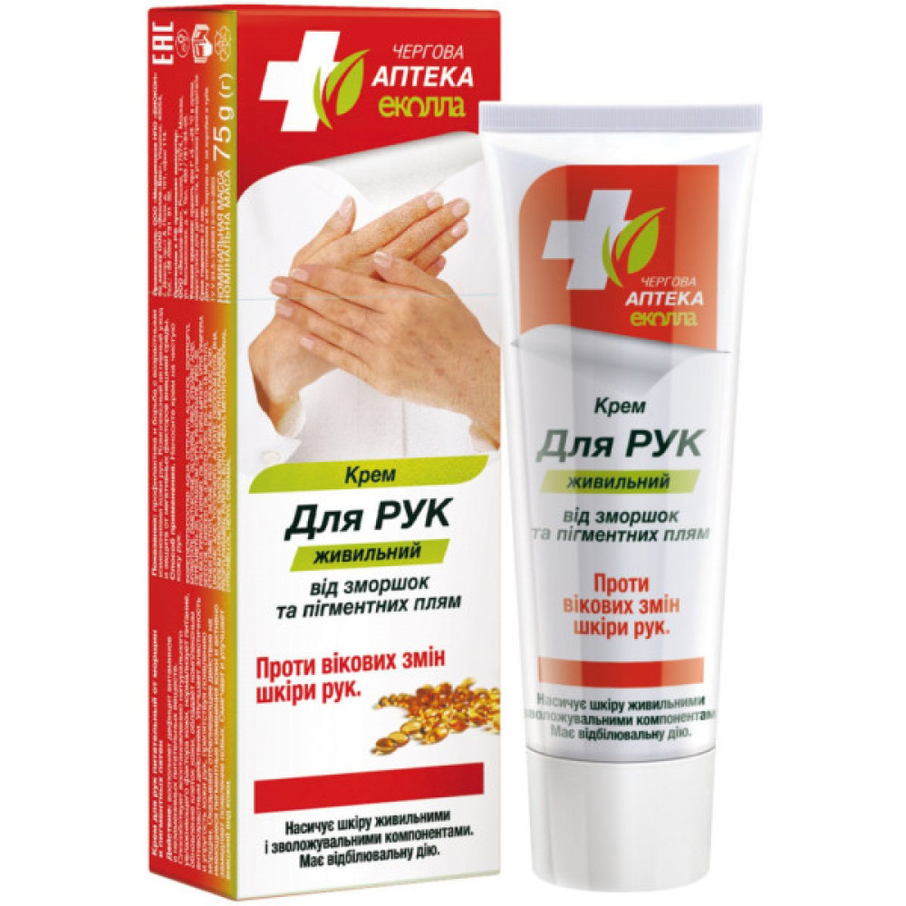 Крем для рук з серії "Чергова Аптека Еколл" Проти вікових змін шкіри поповнює дефіцит вітамінів і незамінних поживних речовин. Сприяє відновленню натурального зволожувального чинника шкіри, нормалізує живлення, оновлення клітин шкіри, має комплексну антивікову дію. Покращує еластичність і пружність шкіри рук, перешкоджаючи появі зморшок. Надає вибілювальної дії на наявні пігментні зміни шкіри й активно вповільнює появу нових. Пом'якшує й покращує зовнішній вигляд шкіри.