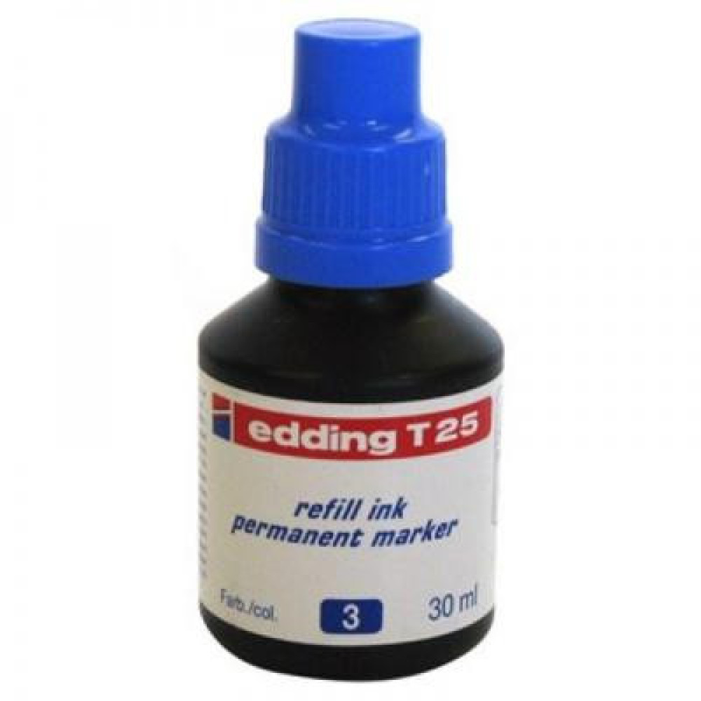 Чорнило edding-T25 володіє світлостійкістю і швидко висихає на поверхнях. Водостійкий і зносостійкий практично на всіх поверхнях. Чорнило без додавання толуолу / ксилолу, практично без запаху в пляшечках місткістю 30 мл. Просто встановіть маркер наконечником в заправку, і через годину маркер готовий знову писати. Фарба Edding для Permanent e-T25 blue застосовується для заправки перманентних маркерів Edding.