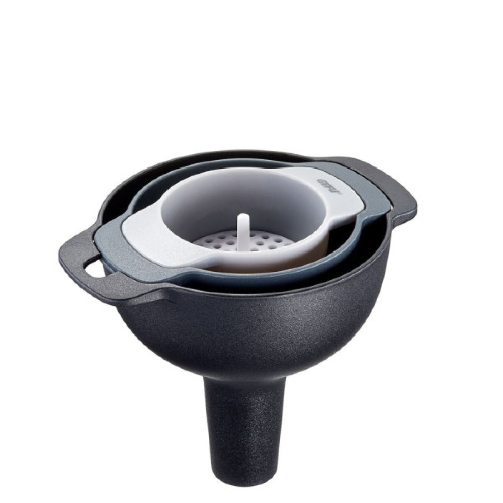 TRES ви миттєво знайдете потрібну лійку для наливання та переливання рідин. Набір економить місце, його легко зберігати, а продумана вставка-сіто за потреби підійде до будь-якої з трьох лійок.