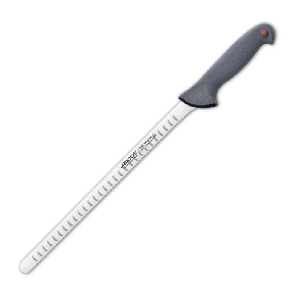 Ніж для риби 350 мм серії «Сolour-prof» Arcos із серейторним краєм підходить для обробки та нарізання риби різних розмірів. За рахунок серейторного краю леза, ніж легко нарізає навіть найжорсткіше м’ясо риби, а також призначений для волокнистих матеріалів.