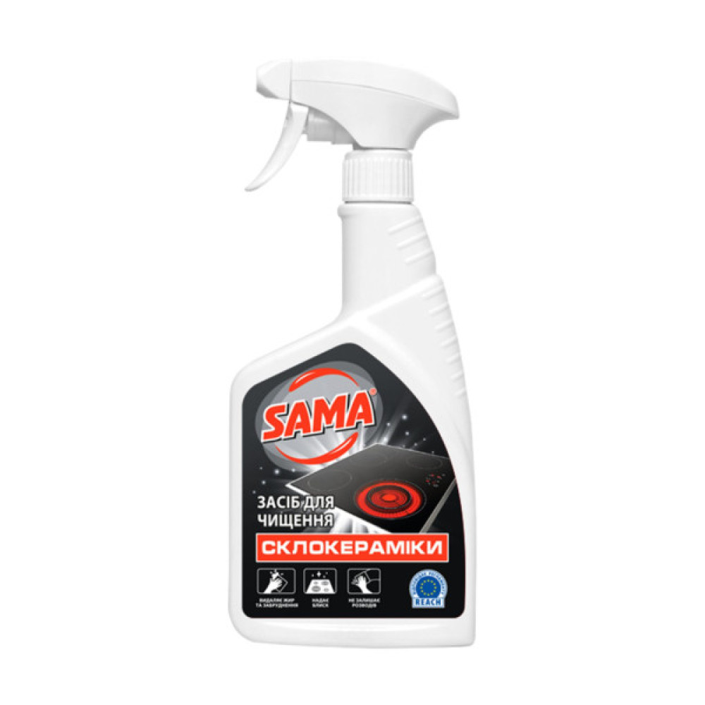 Засіб для чищення склокерамічних поверхонь ТМ SAMA швидко й ефективно видаляє жир, бруд і пригорілі залишки їжі. Не містить фосфатів та абразивів. Завдяки безпечному складу засіб не пошкоджує поверхню, не залишає розводів і надає блиск поверхні. Призначений для чищення склокерамічних поверхонь (плит, панелей, посуду, сковорідок).