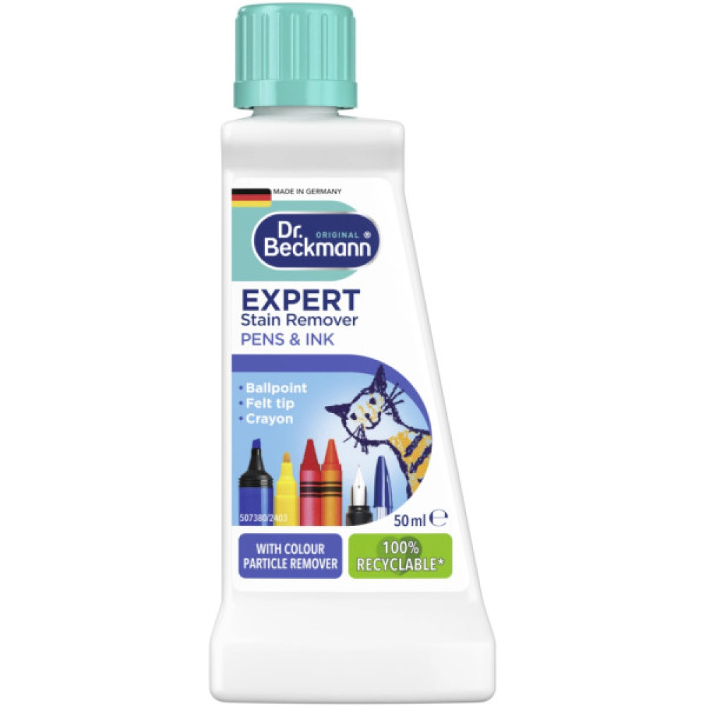 Проблемно-орієнтована формула Dr. Beckmann враховує спеціальні властивості плям від кулькових ручок, інших ручок або водних фарб. За допомогою рідкого засобу для виведення плям зі спеціальним розчинником частинок фарби відбувається видалення фарбувального пігменту з тканин.