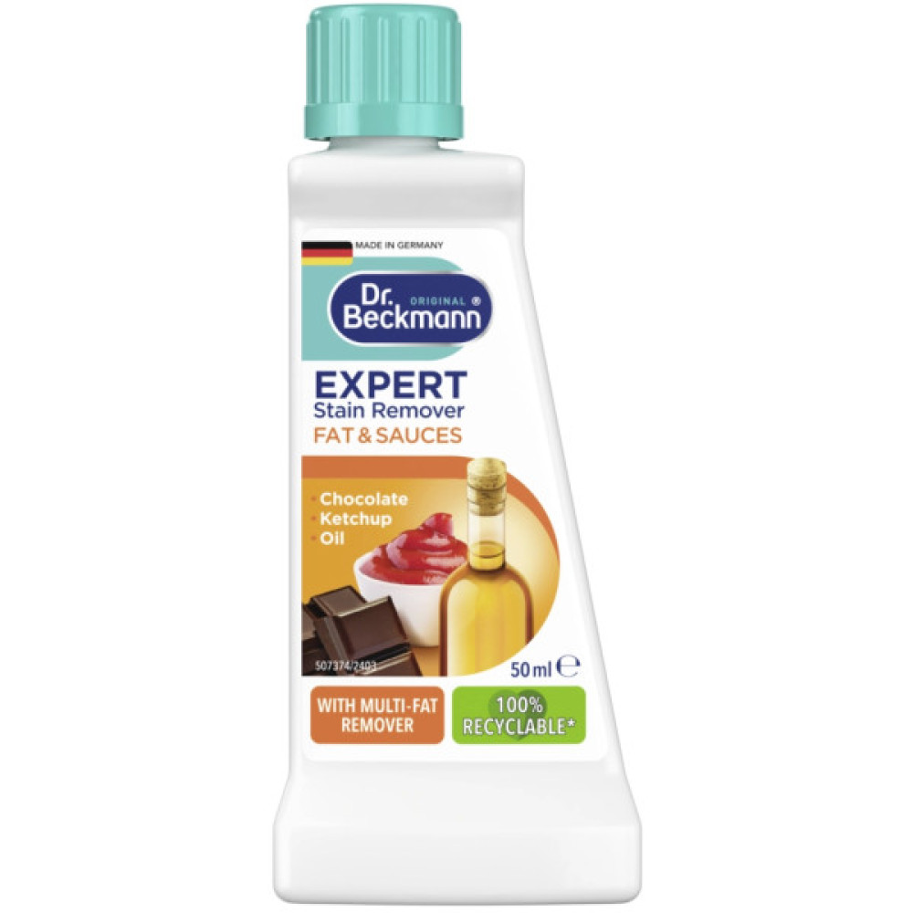 Засіб для видалення плям Dr.Beckmann Експерт Жири і соуси 50 мл (4008455386218) являє собою ефективний засіб для виведення плям, який заснований на спеціальній формулі розчинника жирів в комбінації з різними ПАР. Вони змочують пляму і видаляють його. Всі продукти Dr. Beckmann сертифіковані згідно ініціативної хартії ЄС у відповідності з нормами екології в області побутової хімії.