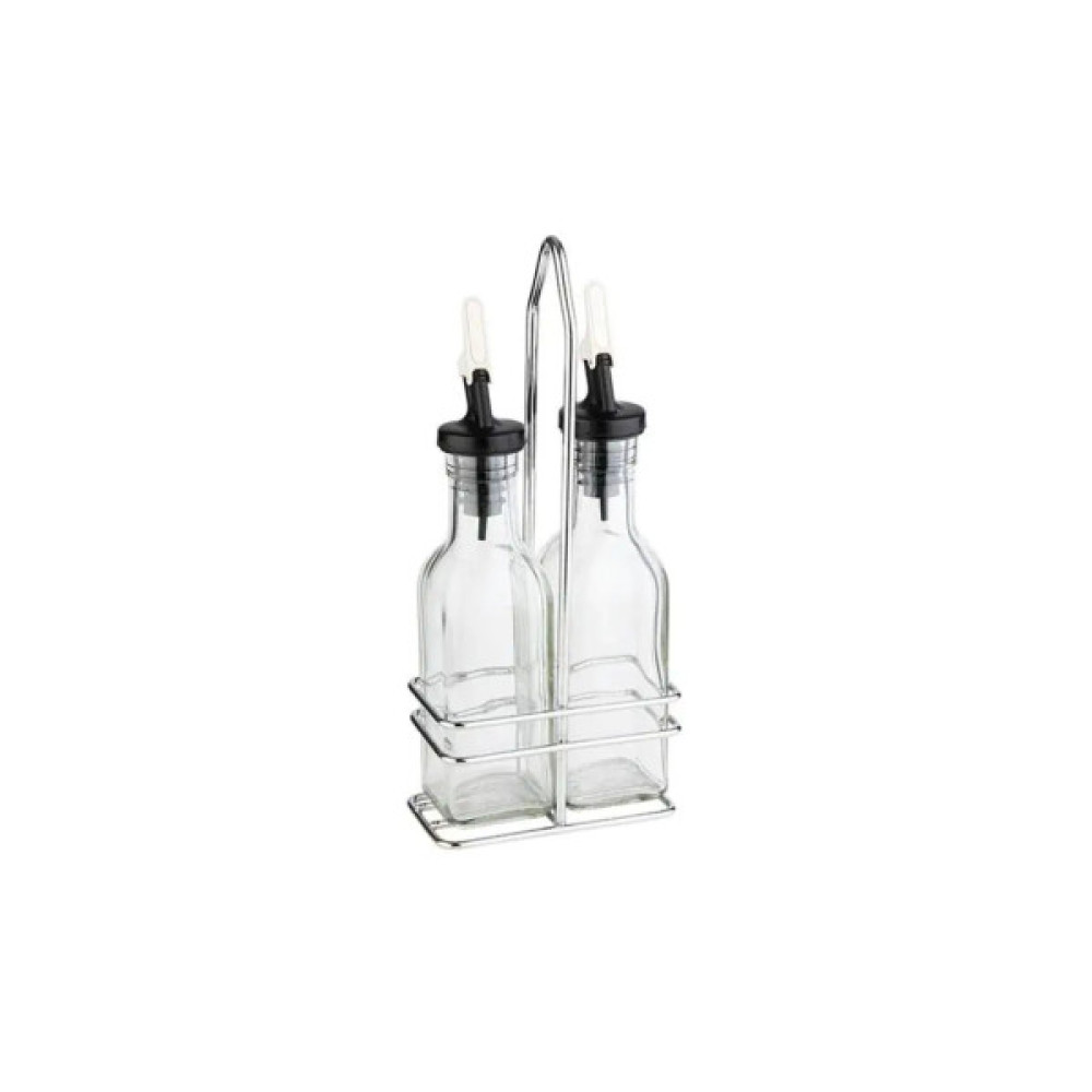 Набор бутылочек от немецкого производителя APS создан из высококачественных материалов. В комплект входит стальная подставка, две стеклянные бутылки и две крышки для удобного дозирования с заглушками. В данных емкостях можно хранить как масло и уксус, так и различные жидкие соусы.