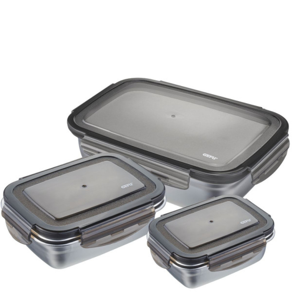 Набір контейнерів для зберігання їжі Preppo, 3 шт. Ваш холодильник буде вражений: він ще ніколи не бачив таких елегантних контейнерів для зберігання їжі. Preppo випромінює високоякісну нержавіючу сталь і має герметичну пластикову кришку, що клацає. Міцний контейнер на 100% герметичний, універсальний і залишається свіжим особливо довго. Багаторазове використання з додатковою вартістю. Чим довше ви можете використовувати продукт, тим краще для навколишнього середовища. Gefu свідомо робить ставку на довговічні продукти багаторазового використання, які допомагають уникнути пластикових відходів і зберегти цінну сировину та енергетичні ресурси. Завдяки тривалому терміну придатності немає потреби постійно купувати екологічно шкідливі одноразові продукти - корисно для природи, корисно для вашого гаманця.