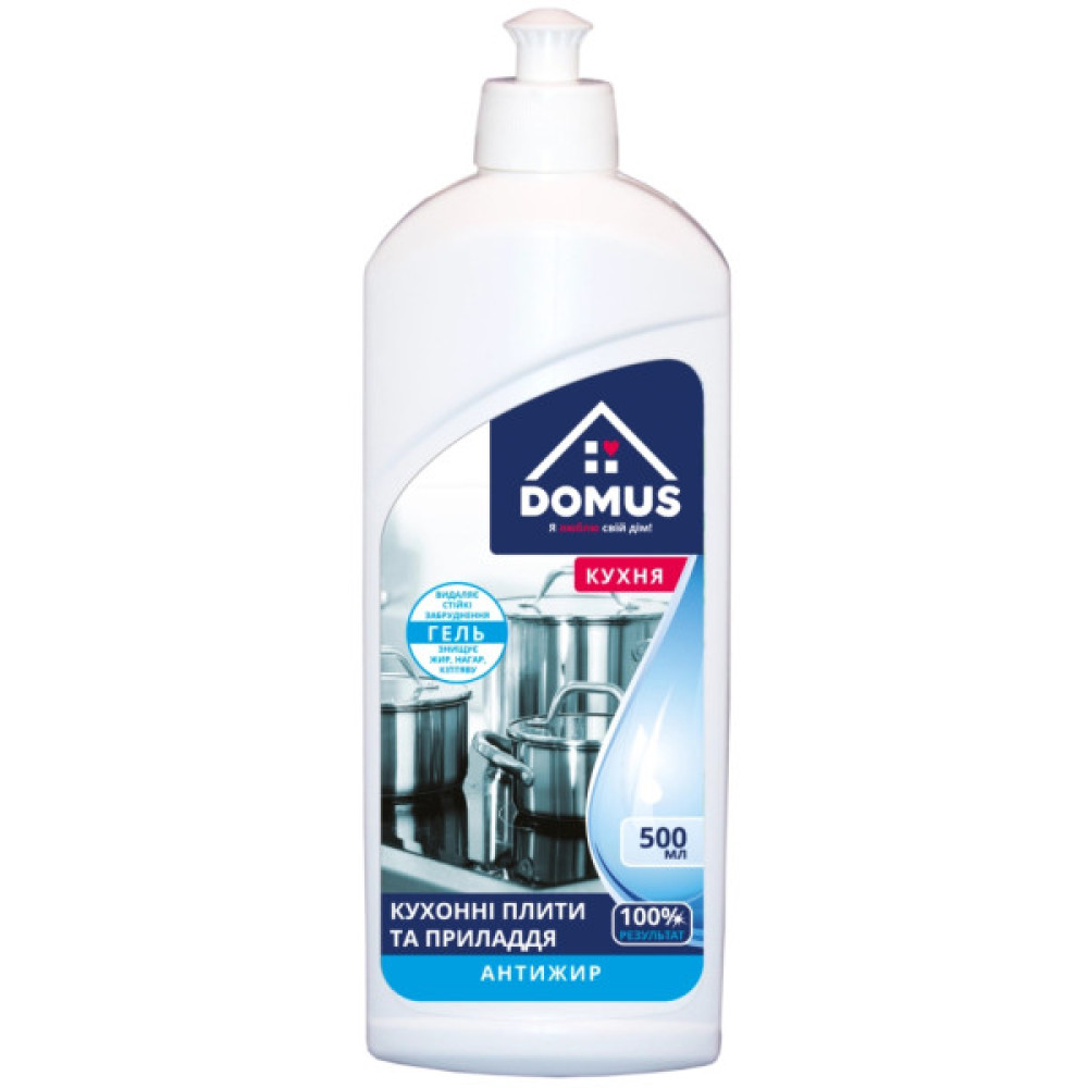 Засіб для видалення забруднень, жиру, кіптяви Domus швидко та ефективно видалить стійкі жирові забруднення, нашарування кіптяви та накипу з поверхонь кухонних плит, духовок, емальованих мийок, каструль та кахельних поверхонь.