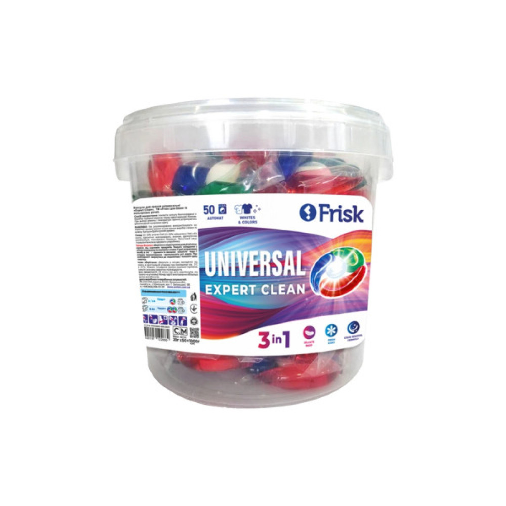 Універсальні капсули для прання Frisk Expert Clean спеціально розроблені для зручного та дбайливого догляду. Забезпечують ефективне прання та очищення від забруднень і зберігають одяг та білизну в ідеальному стані. Підходять для прання кольорових та білих речей з бавовняних, лляних та синтетичних тканин, а також тканин зі змішаних волокон у пральних машинах будь-якого типу.