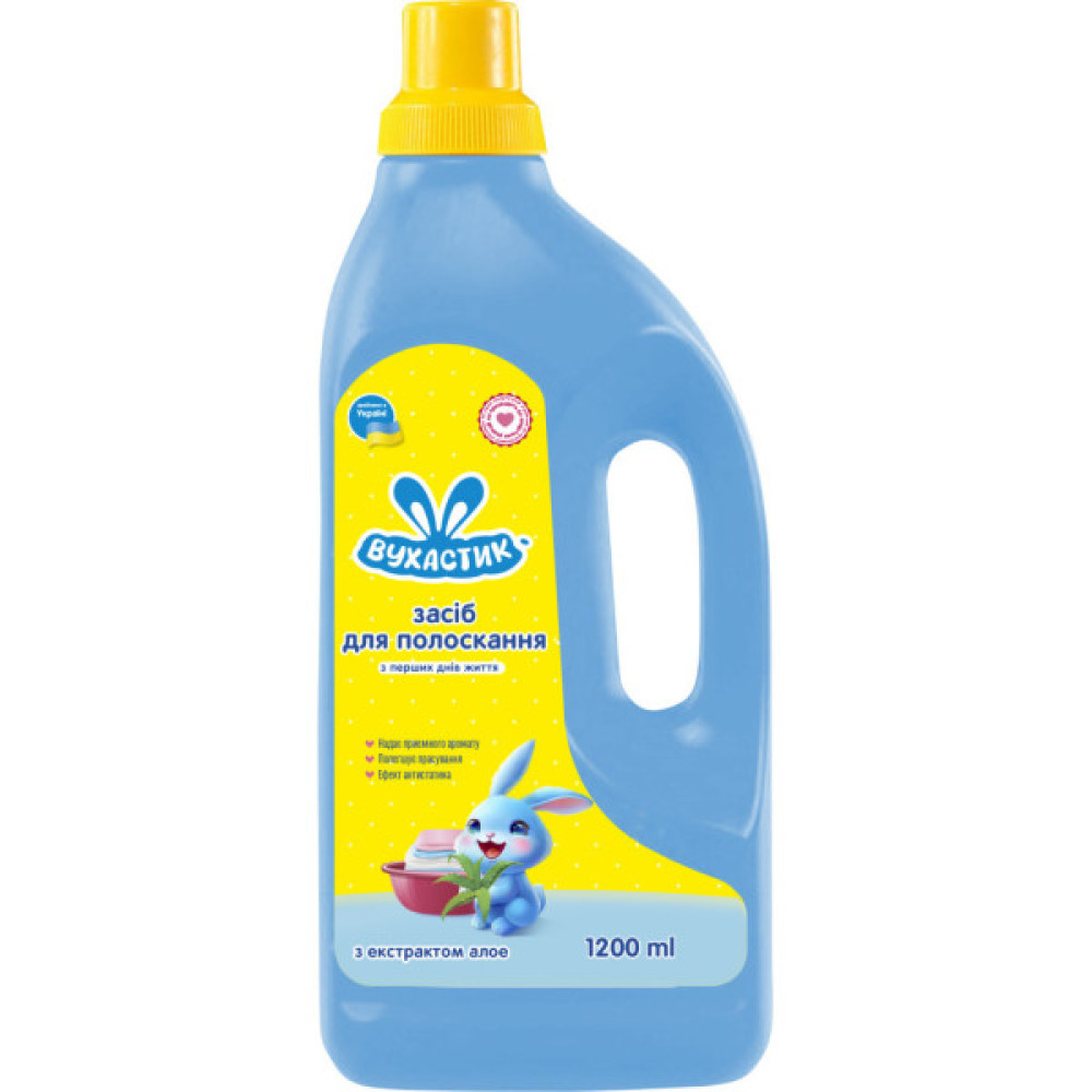 Засіб для полоскання білизни Вухастик чудово пом'якшує дитячу білизну після прання, надає антистатичного ефекту. Підходить для обробки білизни дітей будь-якого віку, зокрема новонароджених, і людей, схильних до алергічних реакцій.