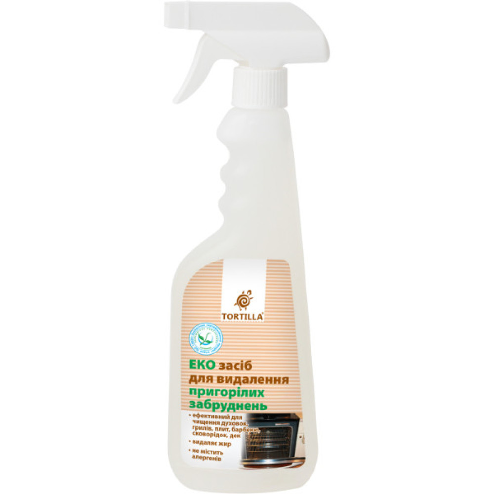 Екозасіб для видалення пригорілих забруднень "Тортілла" для чищення плит, духовок, сковорідок, деко, а також будь-яких керамічних, емальованих, порцелянових, фаянсових поверхонь від нагару, сажі та кіптяви.