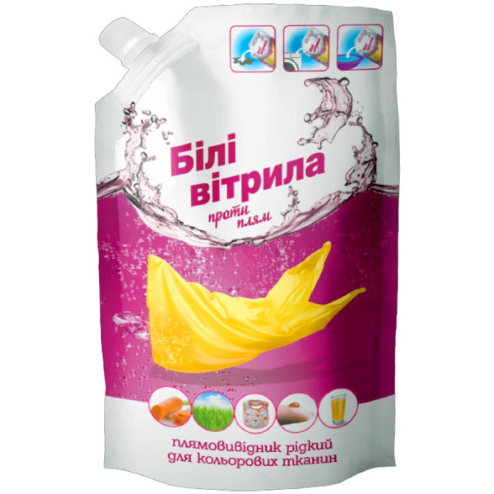 Плямовивідник рідкий для кольорових тканин "Білі вітрила" призначений для прання та виведення плям різного походження. Особливо ефективно виводить плями від трави, крові, фруктів чаю, шоколаду, червоного вина, дитячого харчування, специфічних дитячих забруднень тощо. Може використовуватися для різних видів кольорових тканин у пральних машинах будь-якого типу або ручного прання навіть при низьких температурах. Сумісний з будь-яким пральним порошком. Не містить хлору та фосфатів. Не рекомендовано для прання виробів з вовни та шовку. Біле та кольорове періть окремо, чітко витримуйте рекомендації з температурного режиму прання, зазначеного на виробі.
