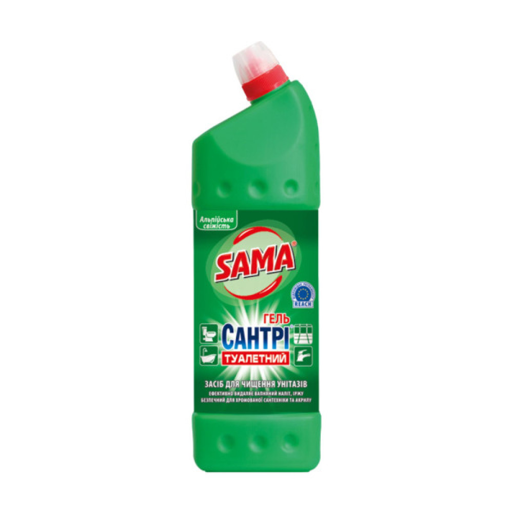Засіб для чищення унітазів ТМ SAMA Сантрі призначений для чищення унітазів, ванн, раковин, робочих поверхонь, кахлю, сантехніки. Ефективно відчистить, видалить мікроби, усуне неприємний запах. За рахунок вмісту у складі кислот дуже добре розчиняє вапняний наліт та сечовий камінь, а також добре справляється з іржею та бактеріями. Усуває неприємний запах і надає поверхні блиску.
