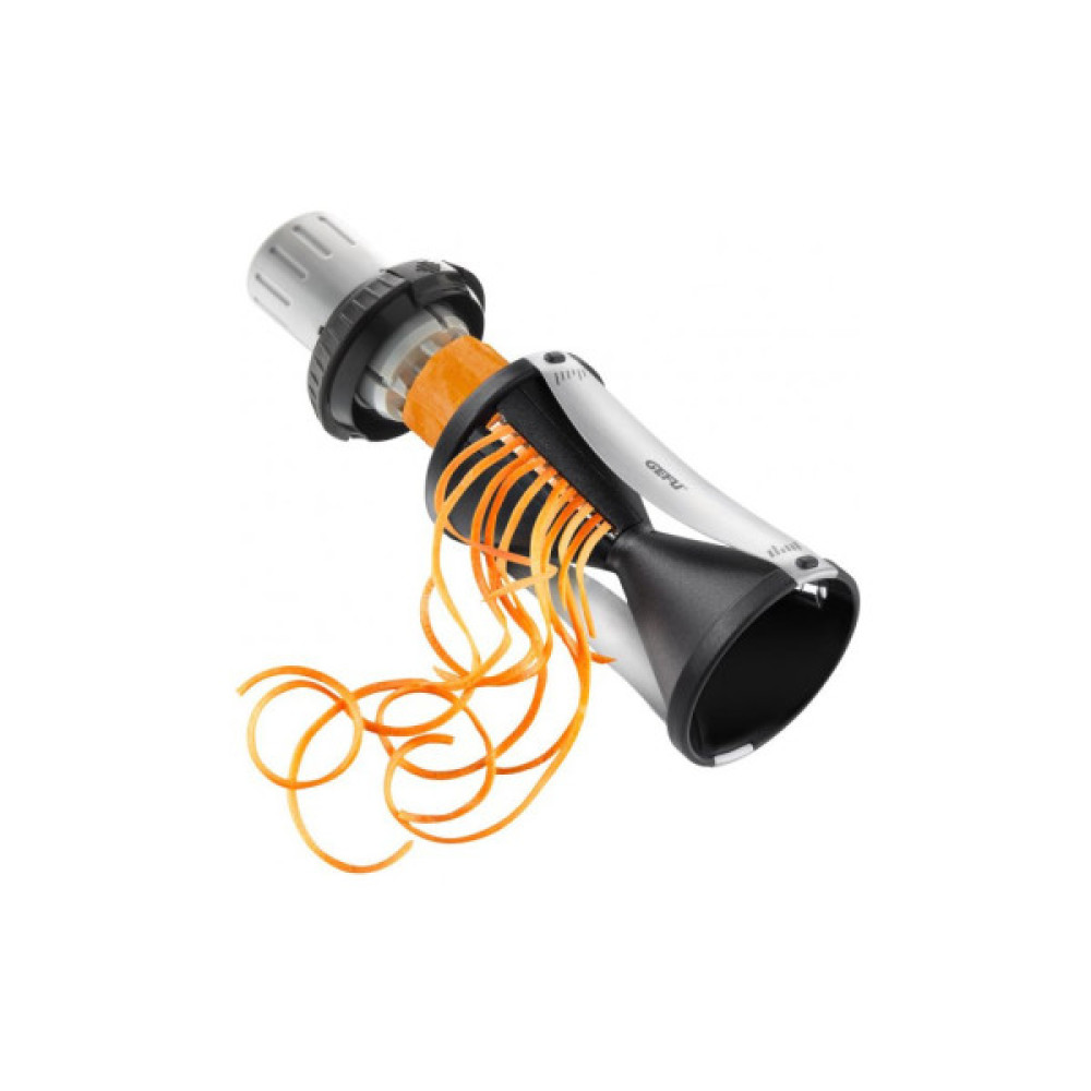 Спіральний ніж Gefu Spirelli 2.0 — практичне й інноваційне кухонне пристосування, яке потішить будь-яку господиню. За допомогою гострих ножів овочі перетворюються на тонку довгу спіраль, яку дуже легко готувати та приємно їсти. Цукіні, огірок, морква, кабачок й інші овочі набувають неповторного вигляду серпантину, який здивує будь-якого гурмана. Тримач допоможе нарізати овочі з мінімальним залишком, а також захистить Ваші пальці від пошкодження об леза Spirelli.