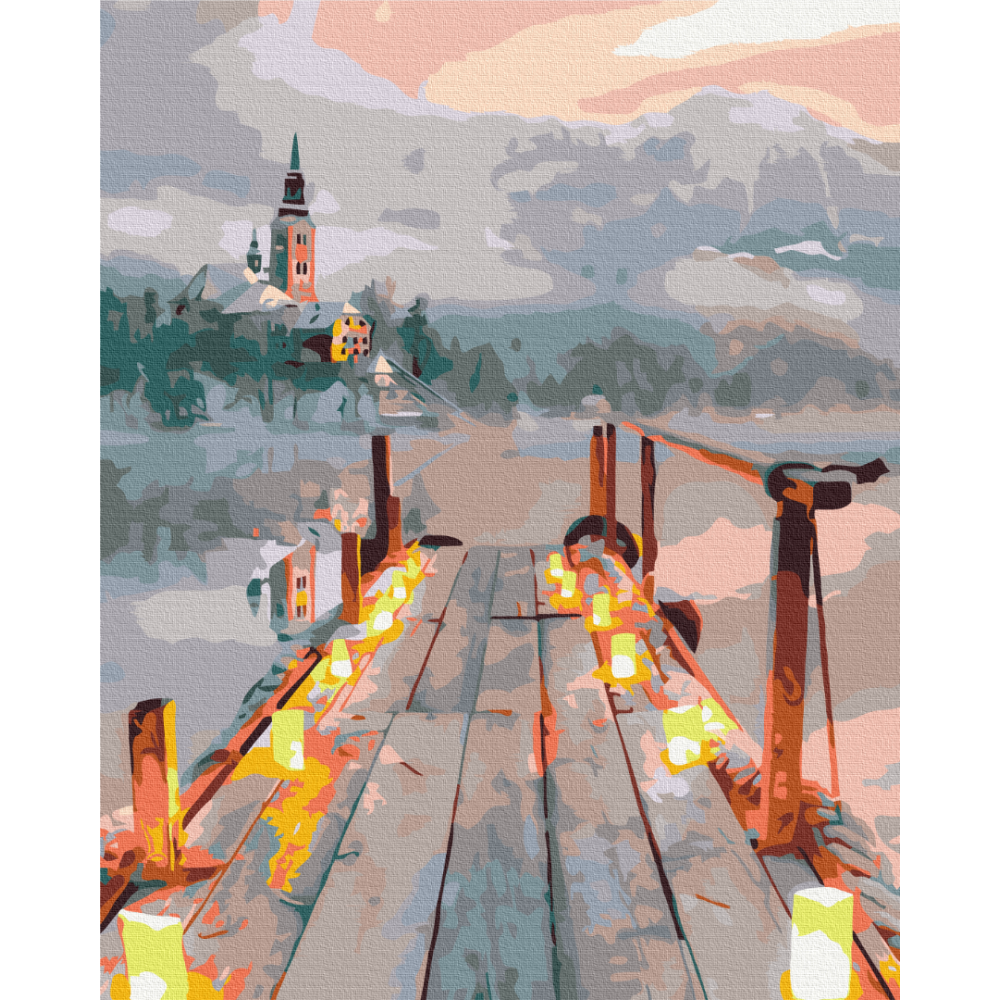 бполотно на лляній основі та дерев'яному підрамнику з нанесеною пронумерованою схемою майбутньої картини. Всі сегменти додатково пофарбовані в тон кольорів, якими буде зафарбовувати полотно