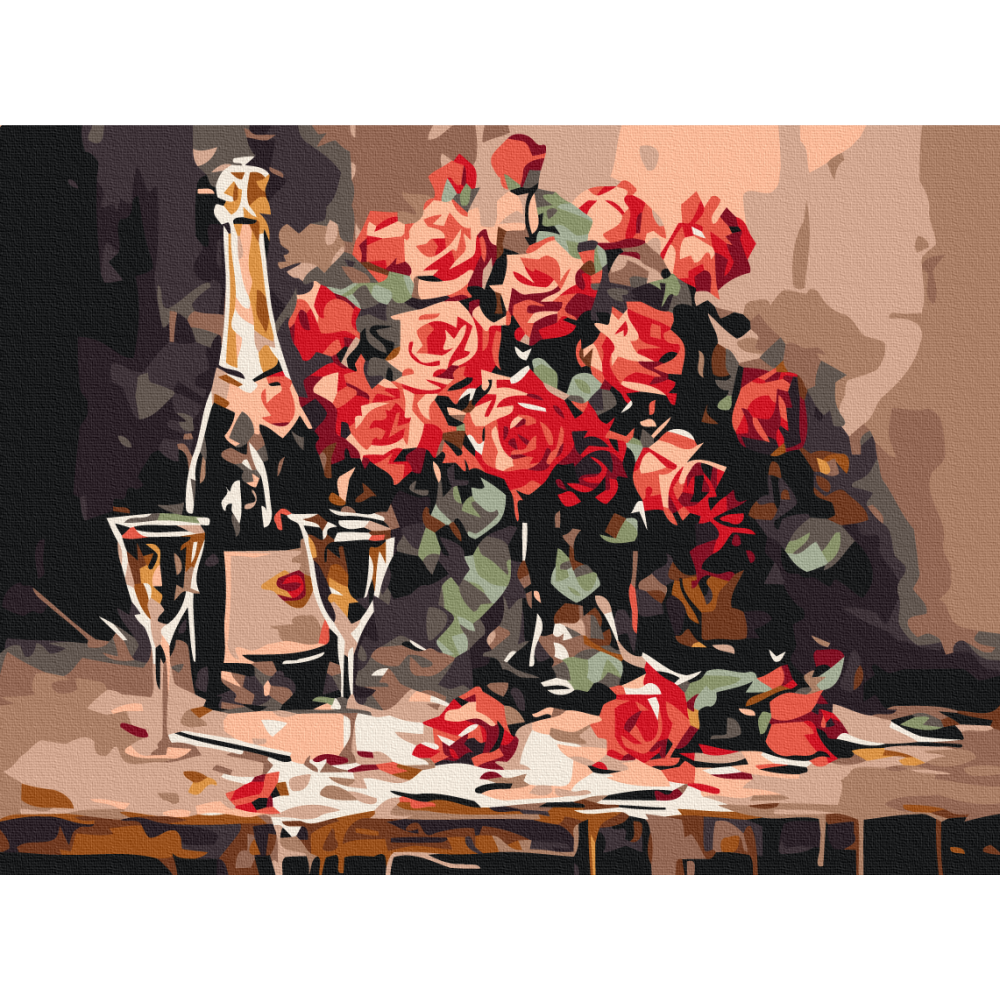 бполотно на лляній основі та дерев'яному підрамнику з нанесеною пронумерованою схемою майбутньої картини. Всі сегменти додатково пофарбовані в тон кольорів, якими буде зафарбовувати полотно
