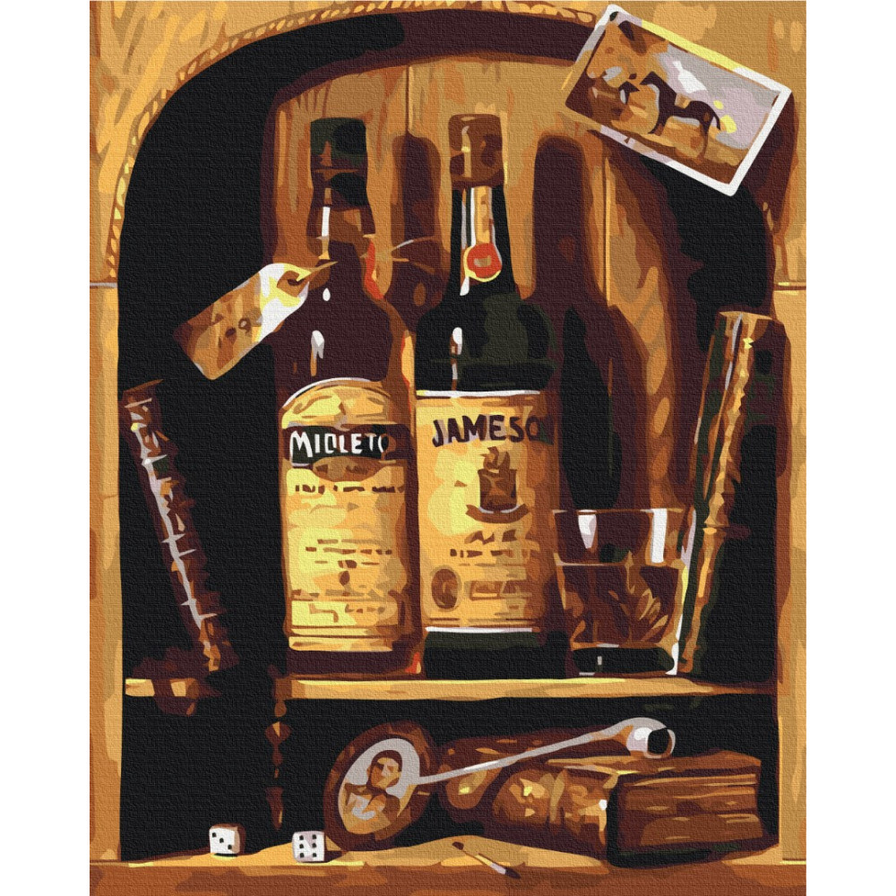 бполотно на лляній основі та дерев'яному підрамнику з нанесеною пронумерованою схемою майбутньої картини. Всі сегменти додатково пофарбовані в тон кольорів, якими буде зафарбовувати полотно