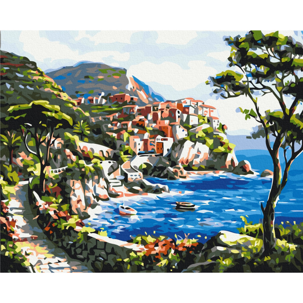 бполотно на лляній основі та дерев'яному підрамнику з нанесеною пронумерованою схемою майбутньої картини. Всі сегменти додатково пофарбовані в тон кольорів, якими буде зафарбовувати полотно
