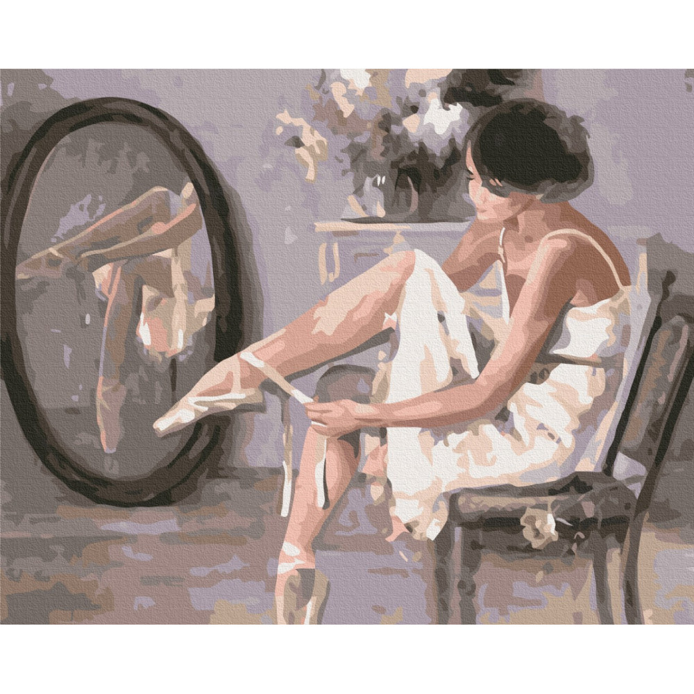 бполотно на лляній основі та дерев'яному підрамнику з нанесеною пронумерованою схемою майбутньої картини. Всі сегменти додатково пофарбовані в тон кольорів, якими буде зафарбовувати полотно