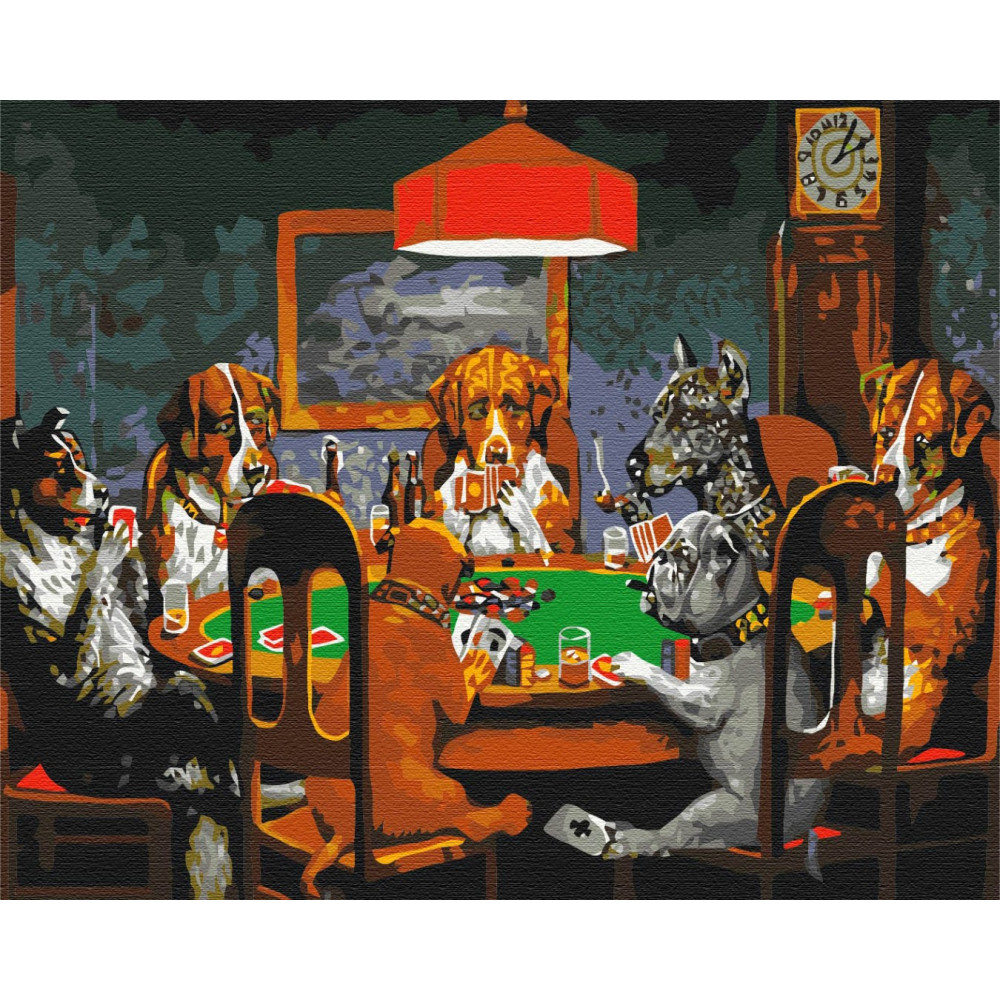 бполотно на лляній основі та дерев'яному підрамнику з нанесеною пронумерованою схемою майбутньої картини. Всі сегменти додатково пофарбовані в тон кольорів, якими буде зафарбовувати полотно