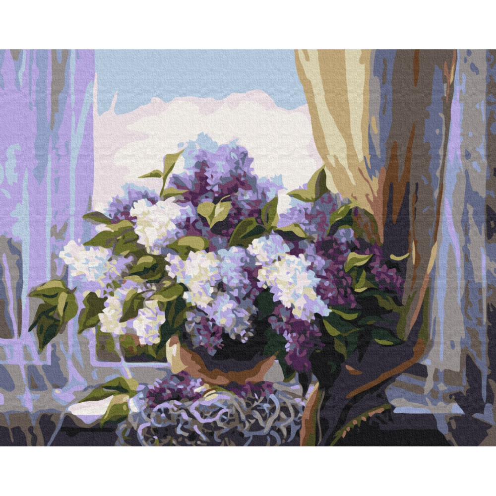 бполотно на лляній основі та дерев'яному підрамнику з нанесеною пронумерованою схемою майбутньої картини. Всі сегменти додатково пофарбовані в тон кольорів, якими буде зафарбовувати полотно