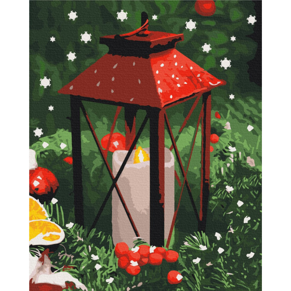 бполотно на лляній основі та дерев'яному підрамнику з нанесеною пронумерованою схемою майбутньої картини. Всі сегменти додатково пофарбовані в тон кольорів, якими буде зафарбовувати полотно