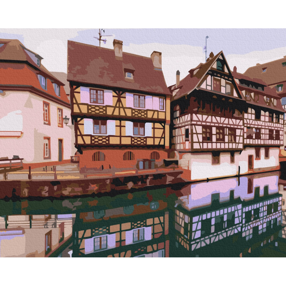 бполотно на лляній основі та дерев'яному підрамнику з нанесеною пронумерованою схемою майбутньої картини. Всі сегменти додатково пофарбовані в тон кольорів, якими буде зафарбовувати полотно