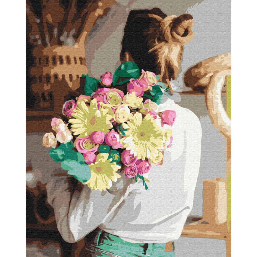 бполотно на лляній основі та дерев'яному підрамнику з нанесеною пронумерованою схемою майбутньої картини. Всі сегменти додатково пофарбовані в тон кольорів, якими буде зафарбовувати полотно