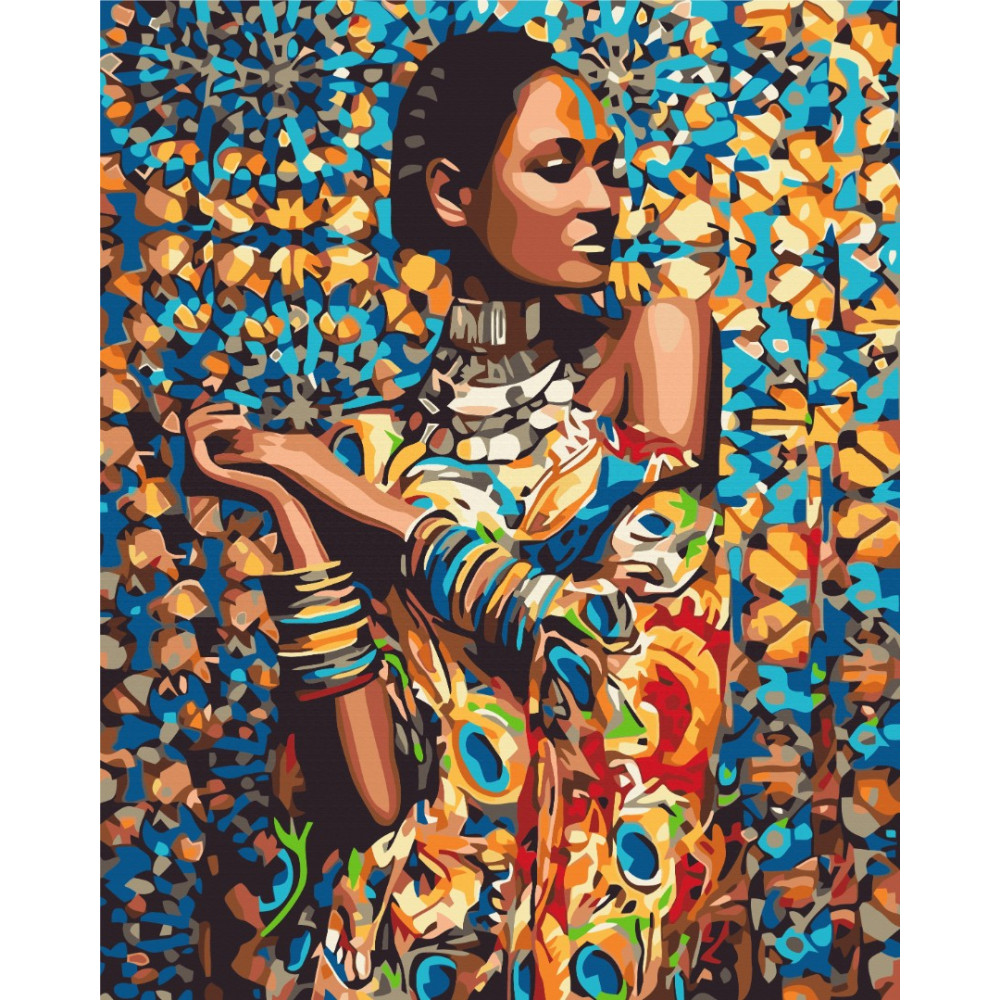 бполотно на лляній основі та дерев'яному підрамнику з нанесеною пронумерованою схемою майбутньої картини. Всі сегменти додатково пофарбовані в тон кольорів, якими буде зафарбовувати полотно
