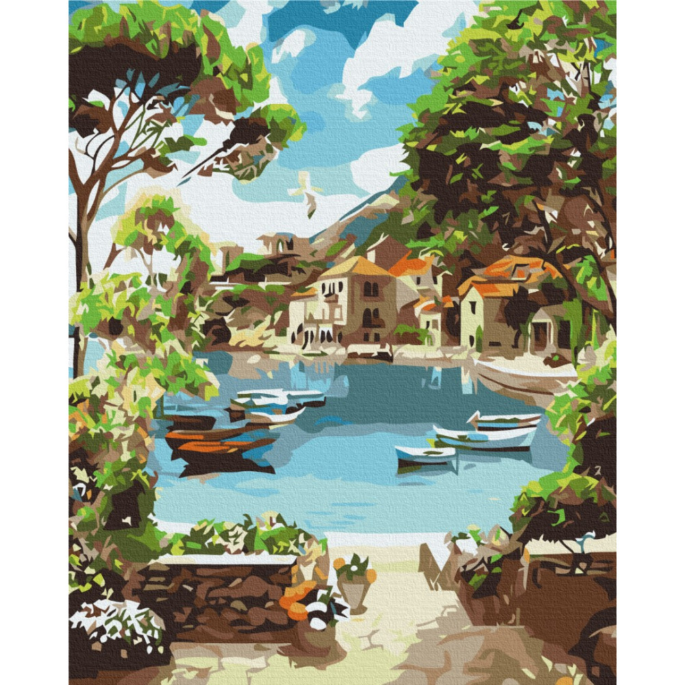 бполотно на лляній основі та дерев'яному підрамнику з нанесеною пронумерованою схемою майбутньої картини. Всі сегменти додатково пофарбовані в тон кольорів, якими буде зафарбовувати полотно