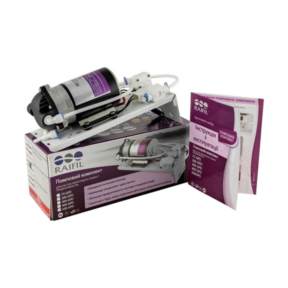 Помпа Raifil RO-500-220 (75G) використовується у побутових системах зворотного осмосу продуктивністю 50 і 75 GPD у випадках, коли тиск води на вході в систему нижчий за необхідний для нормальної роботи. Насос забезпечує підвищення тиску води до робочого рівня, що дозволяє підтримувати стабільну продуктивність очищення.