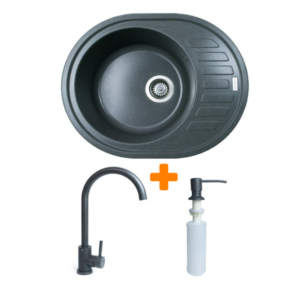 Набір Adamant Ovum поєднує овальну врізну мийку зі штучного каменю з функціональним крилом, змішувачем і дозатором, забезпечуючи комплексне оснащення кухонної зони. Глибока чаша зручна під час миття великого посуду та підготовки продуктів. Структура матеріалу не вбирає барвники, не піддається впливу ультрафіолету та легко очищується. Дозатор дозволяє акуратно подавати миючий засіб, звільняючи поверхню від зайвих пляшок. Уся комплектація підібрана так, щоб створити зручний і практичний простір на кухні.