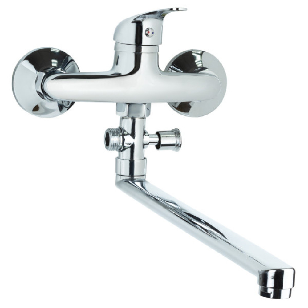 Одноважільний, настінний змішувач для ванни TN-3C242C в хромованому кольорі від Tau, має стаціонарний вилив з виносом 33.5 см, обладнується інтегрованими в стійку виливу бічним перемикачем ванна/душ, нижнім відведенням для під'єднання душового шланга під діаметр 1/2", і встановлюється на два отвори за допомогою ексцентрикового з'єднання під діаметр 1/2".
