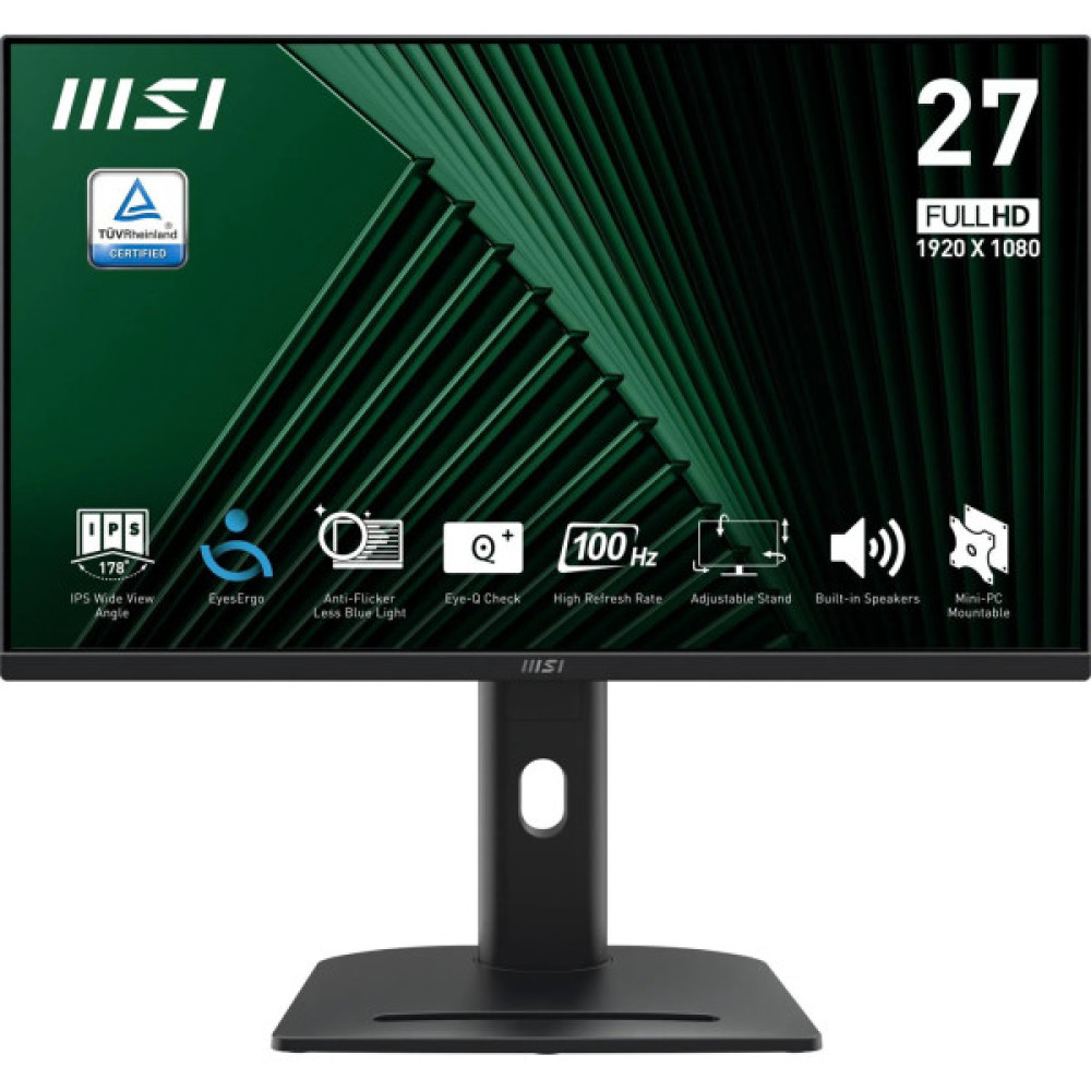 MSI PRO MP275PG — професійний 27" IPS-монітор Full HD з частотою 100 Гц, технологією EyesErgo та сертифікацією TÜV для захисту зору. Має повну ергономіку підставки, точну передачу кольорів (sRGB 93 %), Adaptive-Sync та вбудовані динаміки. Ідеальний вибір для програмування, дизайну, офісної роботи та тривалого використання без втоми очей. Надійний і доступний варіант у лінійці MSI PRO для бізнесу та дому.