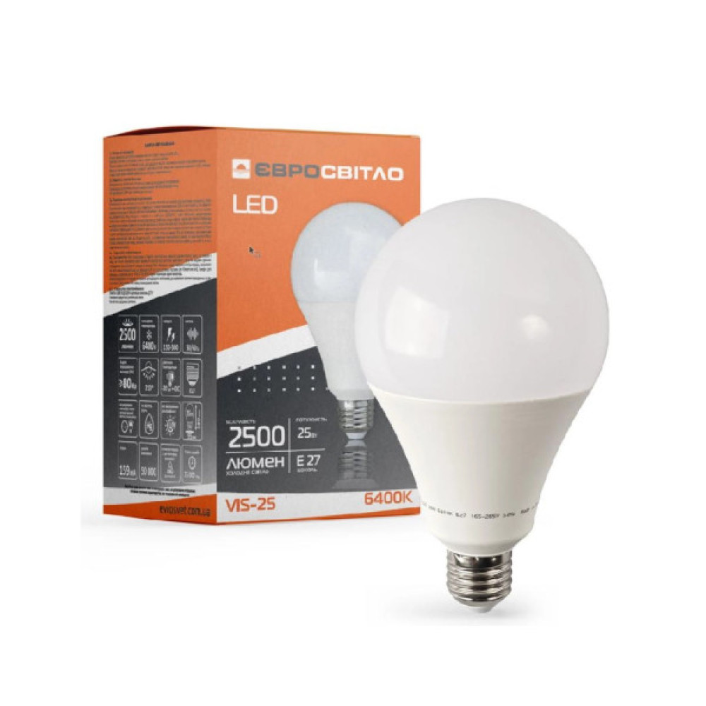 Лампа світлодіодна високопотужна Євросвітло 25Вт 6400К (VIS-25-E27) підходить для місць, де важливо яскраве освітлення, що не спотворює колір.
