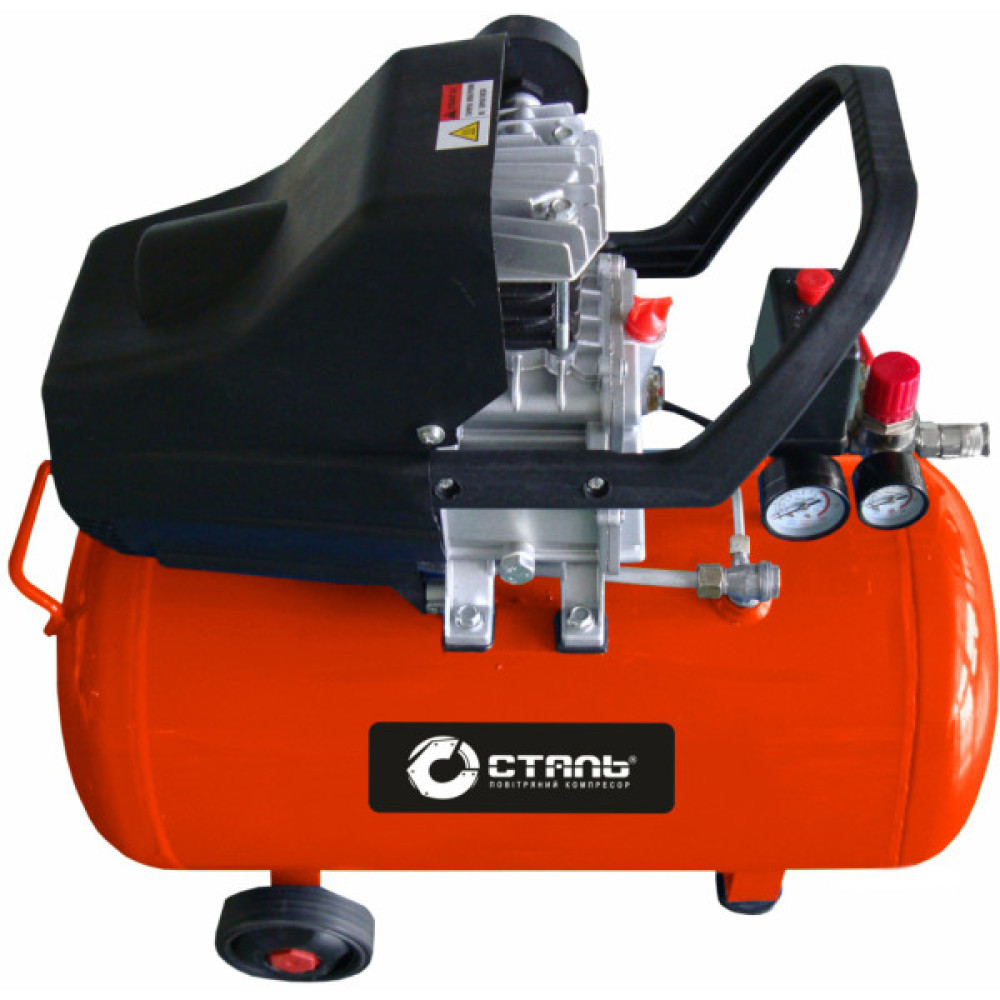 Поршневий компресор СТАЛЬ КСТ-24 з об'ємом ресивера (24 л) призначений для подавання стисненого повітря на різноманітні пневмоінструменти. В основі техніки лежить потужний електричний двигун (1500 Вт), який розвиває швидкість до 2850 об/хв. За умов заявленого робочого тиску 8 барів продуктивність пристрою дорівнює 190 л/хв.