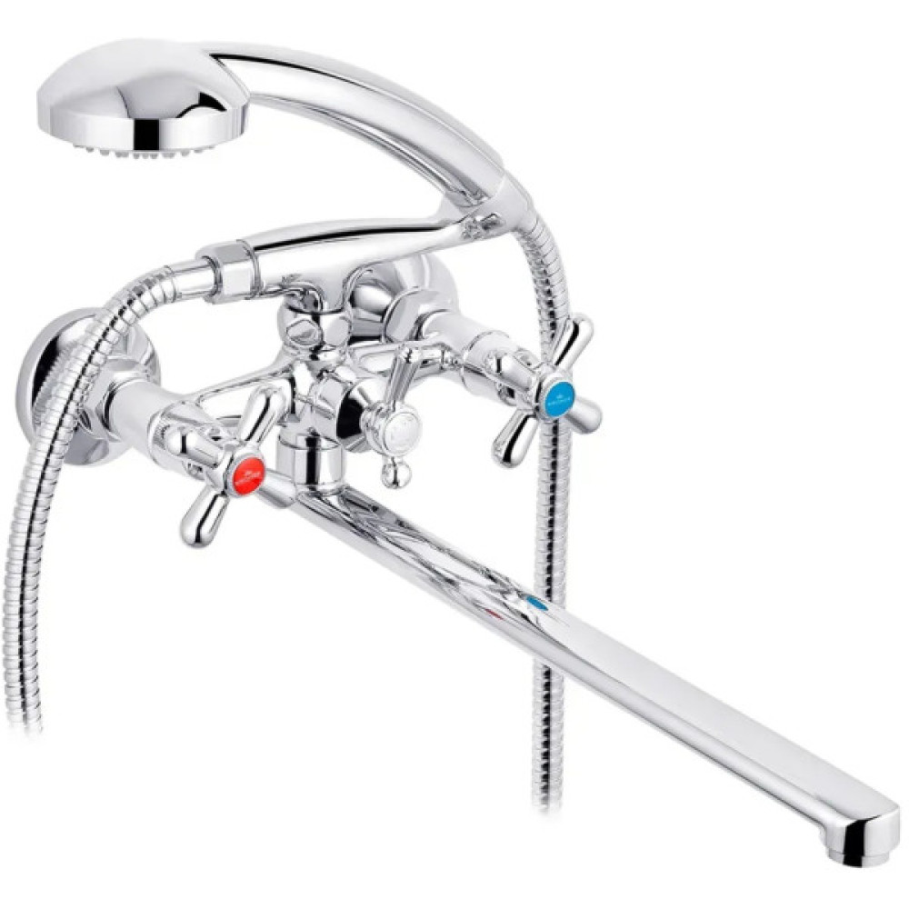 Змішувач для ванни Kroner KRP Royce - C072 з довгим поворотним виливом виготовлено з латуні, укомплектовано душовим шлангом і лійкою. Завдяки хромованому покриттю має міцну поверхню і привабливий зовнішній вигляд. Для включення потоку води передбачено два вентиля. Для перемикання на душ - дивертор. Настінний монтаж здійснюється за допомогою кріпильних деталей, які входять в комплект. Декоративні розетки приховають всі погрішності установки на оздобленні ванної кімнати.