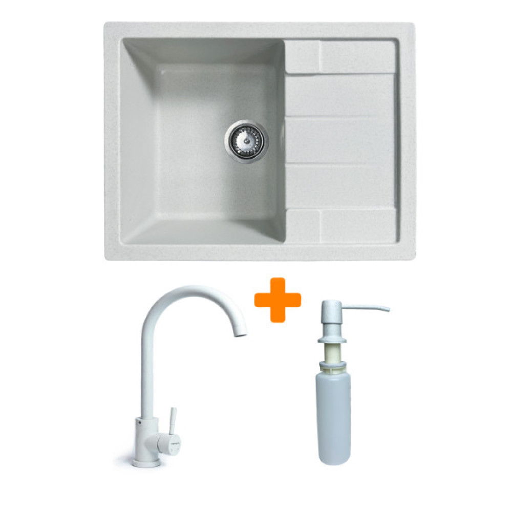 Кухонний набір Adamant Anila об’єднує врізну мийну прямокутної форми зі штучного мінерального матеріалу, змішувач та зручний дозатор. Мийка має практичне крило та глибоку чашу, що підходить для щоденного користування й роботи з великими ємностями. Завдяки технології Solid Surface поверхня стійка до нагріву, подряпин, барвників та дії побутової хімії. Змішувач виготовлений із безпечних матеріалів, забезпечує плавне регулювання та комфортне користування. Вбудований дозатор дозволяє зберігати мийку та стільницю в охайному вигляді, пропонуючи зручний доступ до миючого засобу.