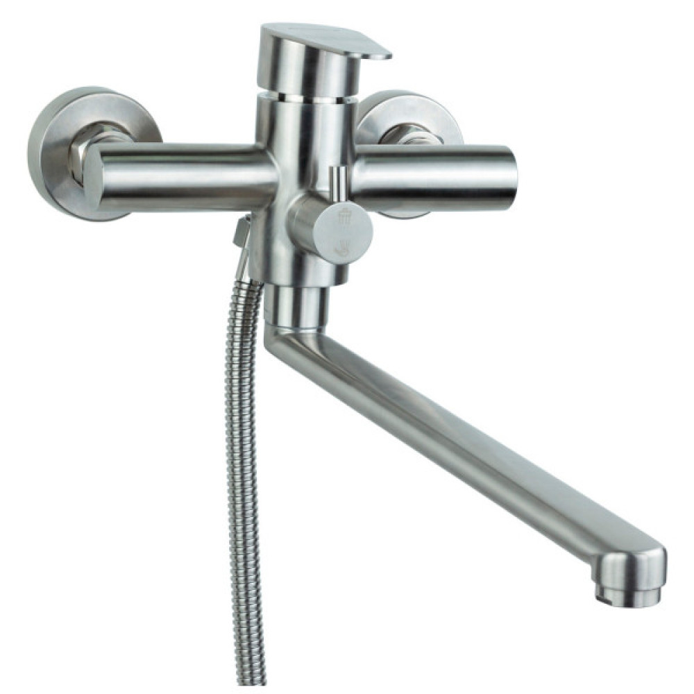 Змішувач комплектується однорежимною ручною лійкою з настінним тримачем і душовим шлангом завдовжки 150 см в металевому обплетенні.