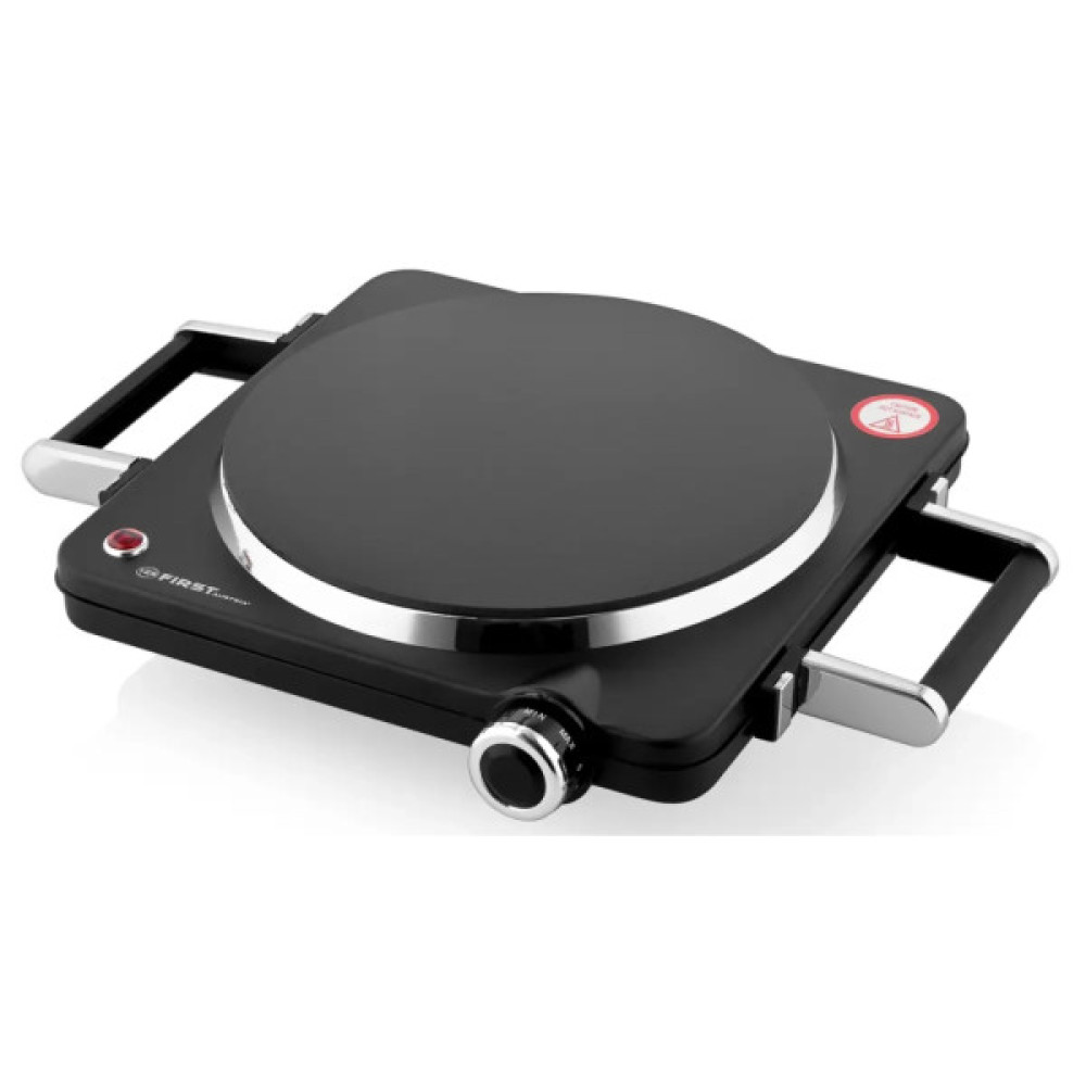 За допомогою прогумованих ніжок, інфрачервона електроплита First FA 5096-5 стійка навіть на слизькій поверхні. З боків до неї кріпляться хромовані ручки. З їх допомогою, плита легко піддається маніпуляціям. На передній частині корпусу розміщені світловий індикатор живлення і механічний, поворотний регулятор термостата. За допомогою термостата, проводиться плавне регулювання температури.