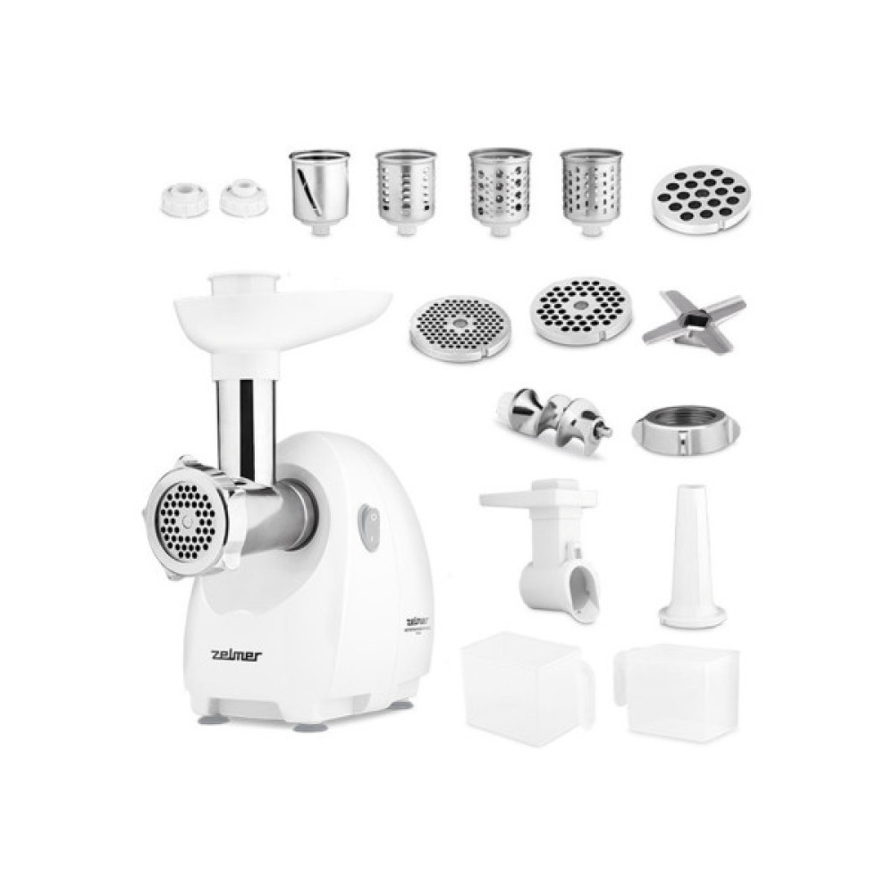 Електрична м'ясорубка Zelmer ZMM4050B замовити в інтернет-магазині. Ви точно залишитеся задоволені придбанням, так як модель має досить високу потужність - 1900 Вт, що дозволяє переробити досить великий обсяг продуктів і отримати за 1 хвилину роботи до 2,5 кілограма фаршу. Модель має дуже велику комплектацію додатковими насадками. Крім стандартних грат у кількості 3 штук з різним діаметром отворів, у наборі насадка для ковбас, шатківниця з 4 терками різного типу нарізки, та соковитискач для томатів та м'яких овочів та фруктів.