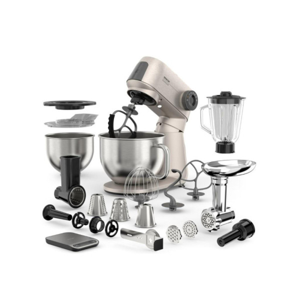 Sencor Gordon — стаціонарна кухонна машина з двигуном потужністю 1500 Вт і повністю металевим корпусом. Оснащена двома чашами з нержавіючої сталі (5,5 л та 4 л) і комплектом із 20 насадок для замішування, подрібнення, збивання та нарізання. М’ясорубка, блендер 1,5 л і тертка з конусами з нержавіючої сталі розширюють функціональність. Підтримка розумних ваг, сумісних із застосунком SENCOR Food, доповнює можливості точного приготування.