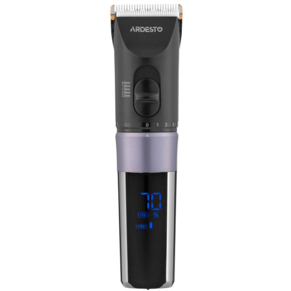 Компактна машинка для підстригання волосся з керамічним лезом, вбудованим акумулятором, LED-дисплеєм та комплектом насадок. Корпус виконано з пластику чорного кольору та доповнено хромованою ручкою. Машинка підтримує регулювання довжини підстригання без використання насадок, а для зручного зберігання передбачена підставка з можливістю підзарядки.